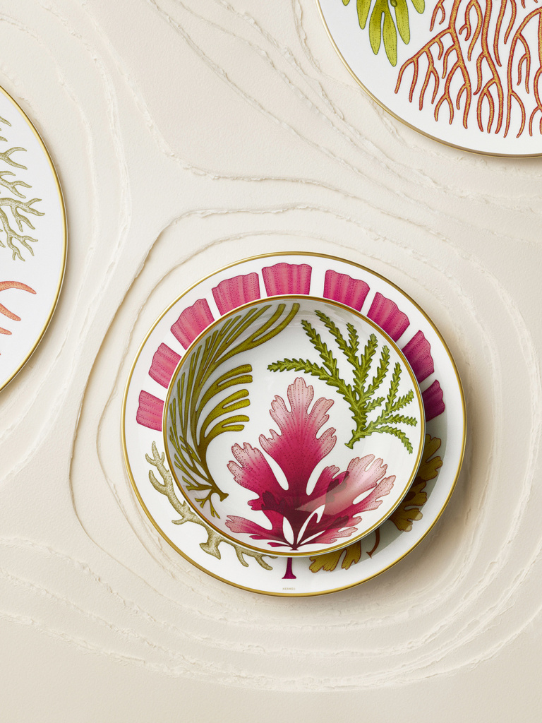 Pour Hermès, l’artiste britannique Katie Scott s’est inspirée de ces traits lumineux et délicats, dessinés désormais sur un service de table jailli du fond des mers…