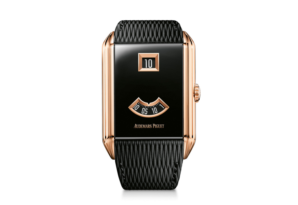 Neo Frame Heure sautante, Audemars Piguet, mouvement automatique, boîtier or rose et glace saphir, prix sur demande.