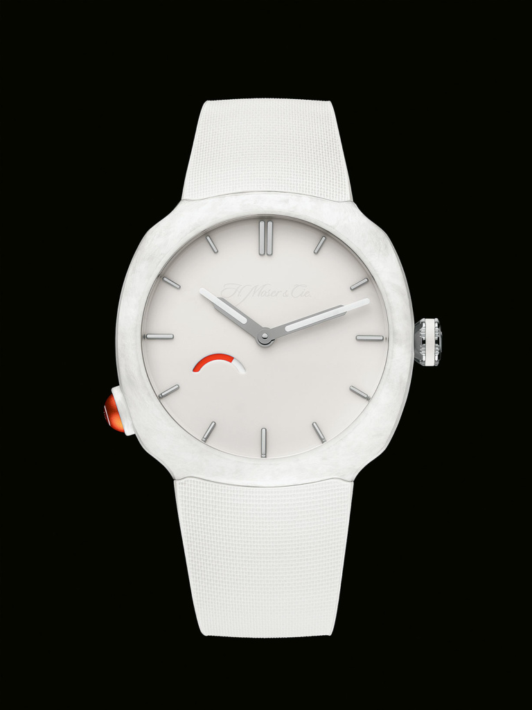 Et si on remontait sa montre en appuyant sur un bouton? En s’inspirant de la basket Pump de Reebok, H. Moser & Cie remplace la couronne par un poussoir en aluminium anodisé orange.