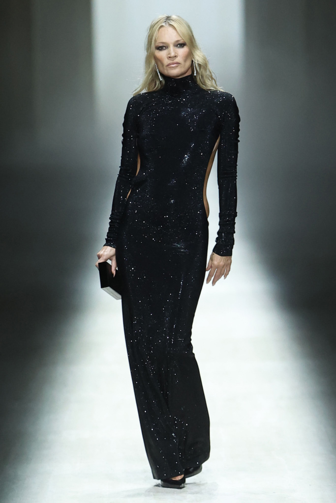 Der Rhythmus wird von einem Soundtrack bestimmt, der von Techno bis zu klassischen italienischen Liedern reicht. Fünfzehn Minuten voller Intensität, in denen jeder Look einen Dialog mit der Epoche zu führen scheint. Bei Look 12 läuft das Model mit einem Telefon in der Hand über den Laufsteg und verstaut es dann in ihrer Tasche mit GG-Logo: Selbstbewusstsein und Faszination für das Image. Das britische Model Kate Moss beendet die Show mit einem katzenhaften Gang, voller Sinnlichkeit und Sexappeal. Applaus – kurz, aber herzlich. Die Lichter gehen wieder an, die Spannung lässt nach.