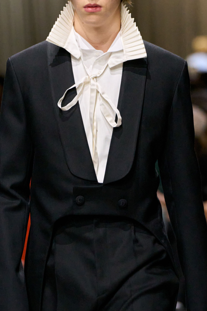 Mit Dior bietet Jonathan Anderson eine radikale Neuinterpretation der zeitgenössischen Schneiderei, indem er sie vom Register der Diskretion in das der Selbstbehauptung überführt. Kein Dresscode, sondern vielmehr ein narratives Mittel, ein bewusst zur Schau gestelltes Zeichen der Vornehmheit. Anderson spielt mit Proportionen und greift auf die klassische Grammatik des Kostüms zurück, um sie dann mit Exzessen zu unterlaufen. Spektakuläre Mäntel mit Pelzärmeln, umhüllende Capes aus Seide, abnehmbare Kragen – all diese Elemente schaffen die Silhouette eines modernen Aristokraten, der eher einer Theaterfigur als einem anonymen Kunden ähnelt. Der Designer zeigt, dass er die klassischen Codes des Hauses perfekt beherrscht, aber alles daran setzt, sie zu dekonstruieren.
