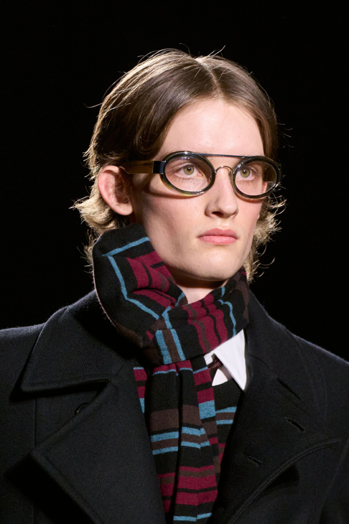 Wenn man von Sartorial spricht, ist Italien als Geburtsort des Anzugs, der richtigen Geste und der als Erbe weitergegebenen Eleganz eine Selbstverständlichkeit. Prada liefert eine scharfsinnige, fast chirurgische Interpretation davon. Die Silhouetten werden gestreckt, die Mäntel verlängern die Linie, formen die Haltung und verleihen eine neue Vertikalität. Signature-Detail: Die Manschettenknöpfe aus Schmuck, die mit dem mythischen „P“ bestickten Hemdsärmel ragen auffällig aus den Jacken heraus, wie ein diskretes, aber unübersehbares Manifest bewussten Luxus.