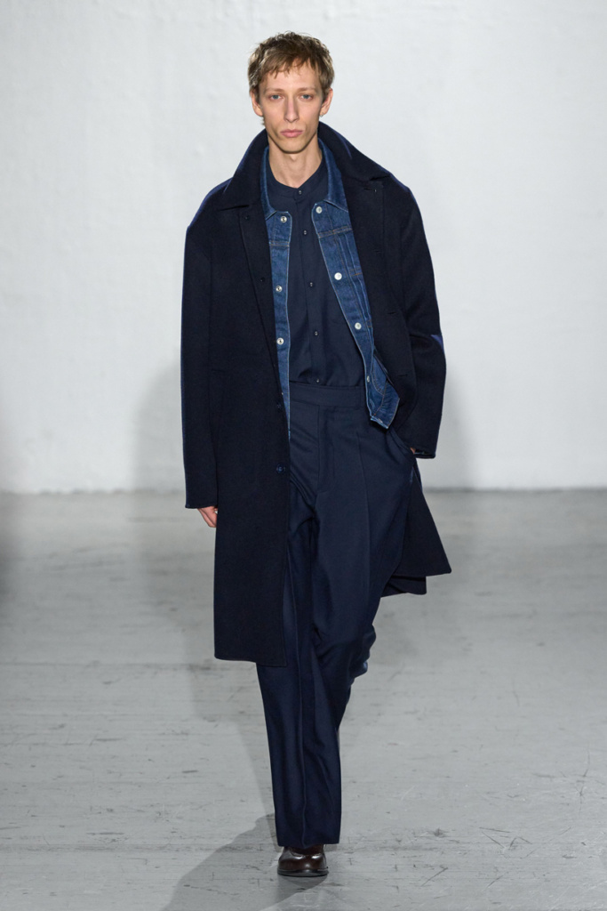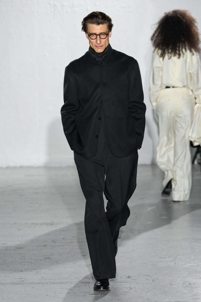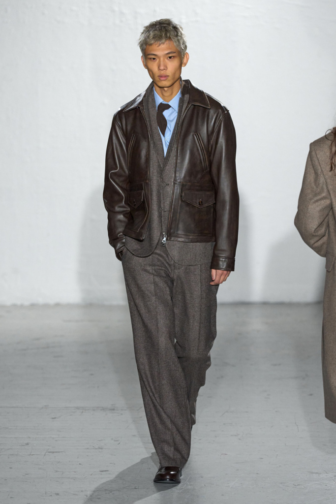 Die Kollektion Officine Générale illustriert treffend, was man als lässige Schneiderkunst bezeichnen könnte. Hier geht es nicht darum, zu beeindrucken, sondern um Kohärenz. Die Silhouetten sind schlicht und basieren auf weiten Mänteln, lockeren Anzügen, patiniertem Leder und anschmiegsamem Strick. Nichts ist starr, nichts ist festgefahren. Man spürt diesen sehr pariserischen Sinn für „gut gemachte“ Kleidung, die auf Langlebigkeit ausgelegt ist. Eine komplette Garderobe, beruhigend, fast selbstverständlich.