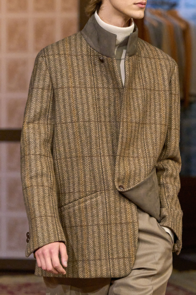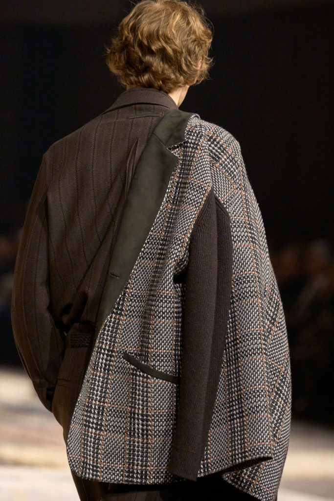 Bei Zegna, dem unangefochtenen Meister der zeitgenössischen Schneiderkunst, wird Strenge nomadisch. Die Mäntel werden nur über eine Schulter geworfen, als wären sie zwischen zwei Terminen im Flug ergriffen worden, und erinnern an einen modernen Flaneur, frei und sicher in seinem Tempo. Der Smoking wird gefaltet getragen, fast unter dem Arm eingeklemmt, lässig, in einer organischen Farbpalette aus Moosgrün und Holzbraun. Selbst die Pullover erfinden sich neu! Um die Taille gewickelt, die Ärmel verstaut, niemals vorne herunterhängend, zeichnen sie eine bis ins Detail kontrollierte Silhouette, lässig, ohne jemals nachlässig zu wirken.