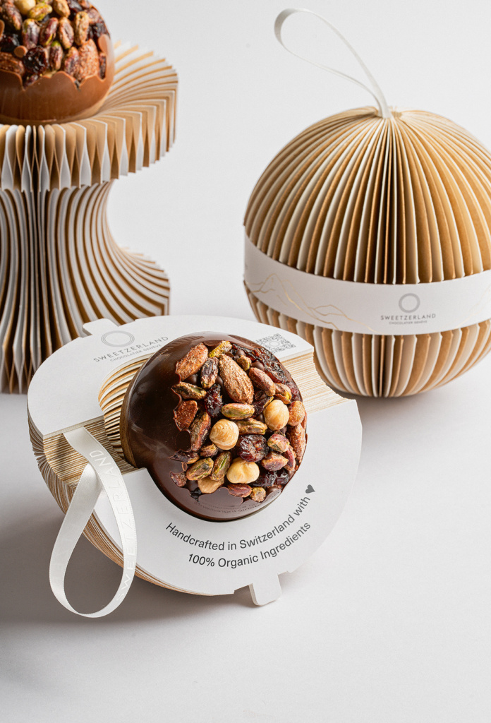 Als Pionierin für Bioschokolade der Spitzenklasse verwöhnt das Genfer Unternehmen Sweetzerland mit seiner Weihnachtskugel den Gaumen. Nachdem man die Süssigkeit genossen hat, bleibt die hübsche Dekoration zurück.