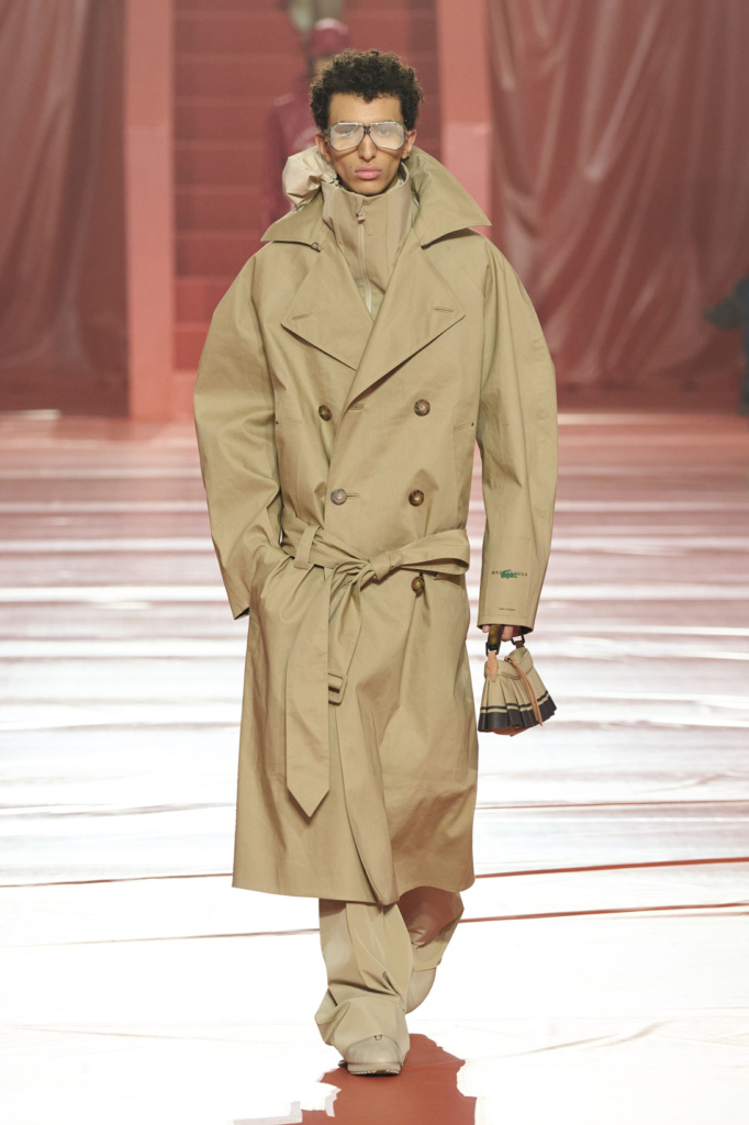 Dieser kleine Styling-Trick lässt sich übrigens ganz einfach nachmachen. Man braucht lediglich einen geraden Mantel und einen Ledergürtel, der etwas locker auf den Hüften sitzt. Der Effekt funktioniert sowohl mit einem kontrastierenden Gürtel als auch in einer Ton-in-Ton-Variante, wie man es bei einigen Looks von Lacoste sehen konnte (Foto links).