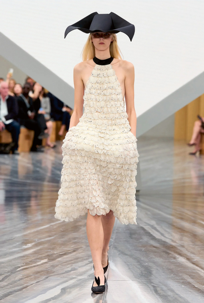 Pierpaolo Picciolis erste Kollektion bei Balenciaga ist als Dialog mit einigen seiner Vorgänger konzipiert, von der skulpturalen Schneiderkunst Demnas bis zur strengen Couture Nicolas Ghesquières. Seine persönliche Note zeigt sich in einer Hommage an die Weiblichkeit (ausschliesslich Kleider, darunter viele Abendkleider), die an die grossen Zeiten des Hauses erinnert. Ein innovativer Stoff umhüllt die Körper wie eine Wolke.