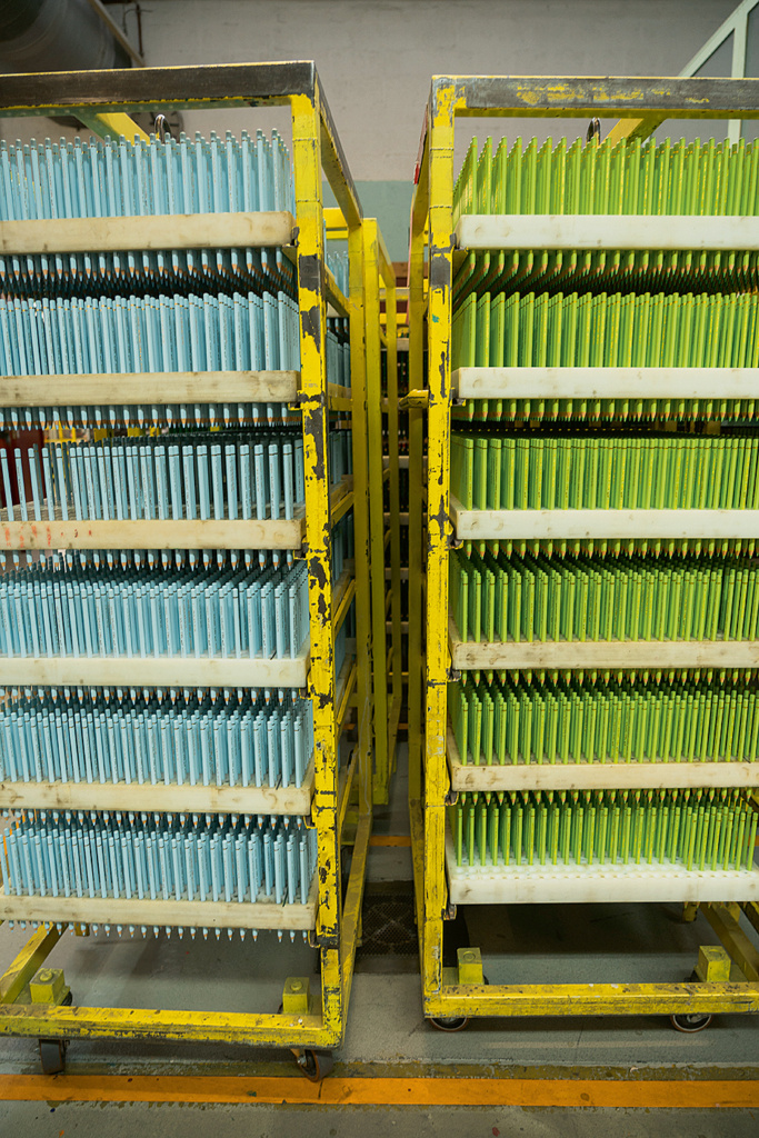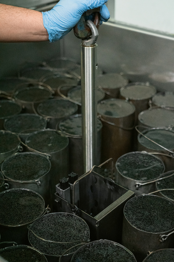 Nachdem sie gut ausgehärtet sind, werden all die grauen und bunten Minen in kleine Körbchen gelegt, bevor sie 24 Stunden lang in ein grosses Wachsbad getaucht werden, ähnlich wie Pommes frites in Öl, damit das Wachs bis ins Innere der Mine eindringen kann. Ohne diesen Vorgang wäre das Schreiben unmöglich.