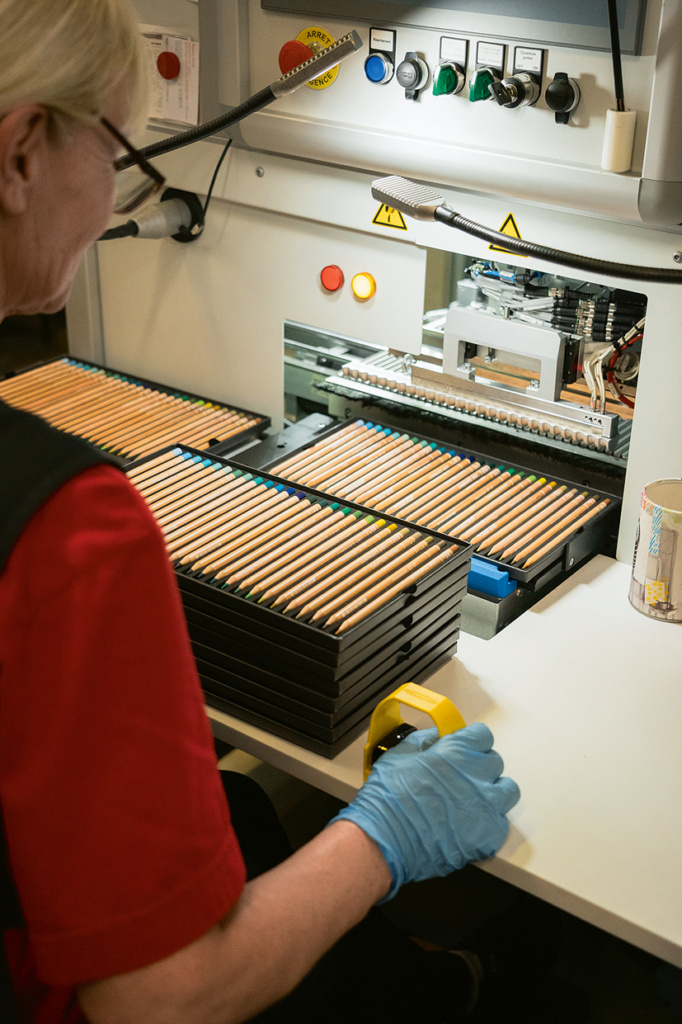 An einem Ende werden sie noch einmal geschnitten, und auf zwei oder drei Seiten wird mit einem erhitzten Stempel eine Markierung angebracht: Name, Farbe, Lichtbeständigkeit, Härtegrad. Der letzte Schliff? Die Spitze des Stifts wird mit einem Harz ummantelt, das eher ästhetischen als schützenden Charakter hat. Am Ende der Produktionskette sorgt eine ganze Reihe von Mitarbeitenden für die optimale Qualität der Produkte. Teile mit kleinen Mängeln – die für das ungeübte Auge manchmal nicht erkennbar sind – werden nicht weggeworfen, sondern an verschiedene Organisationen gespendet, während die anderen liebevoll in den bunten Schachteln des Hauses aufgereiht werden, bereit, die ganze Welt zu erobern.