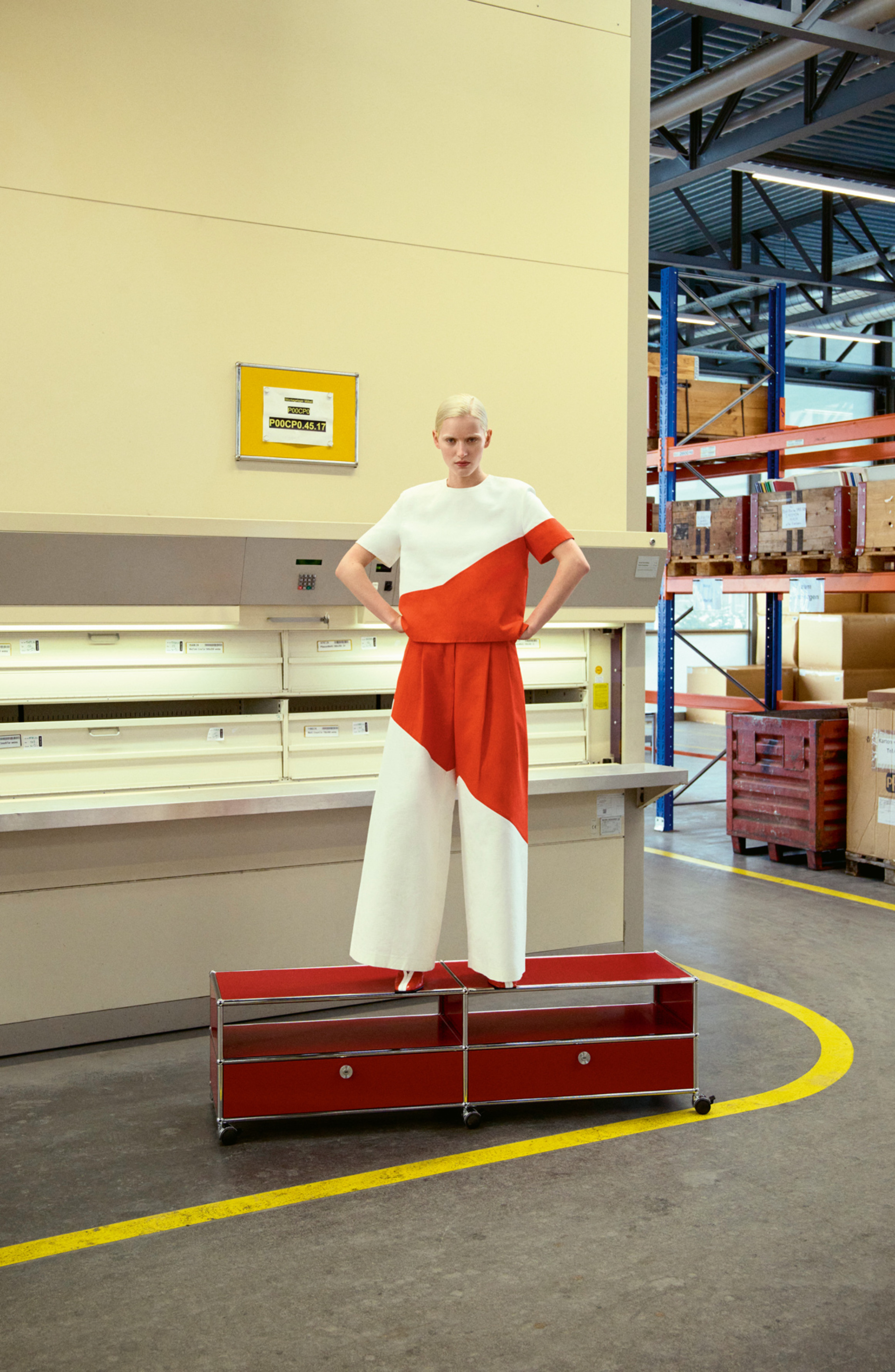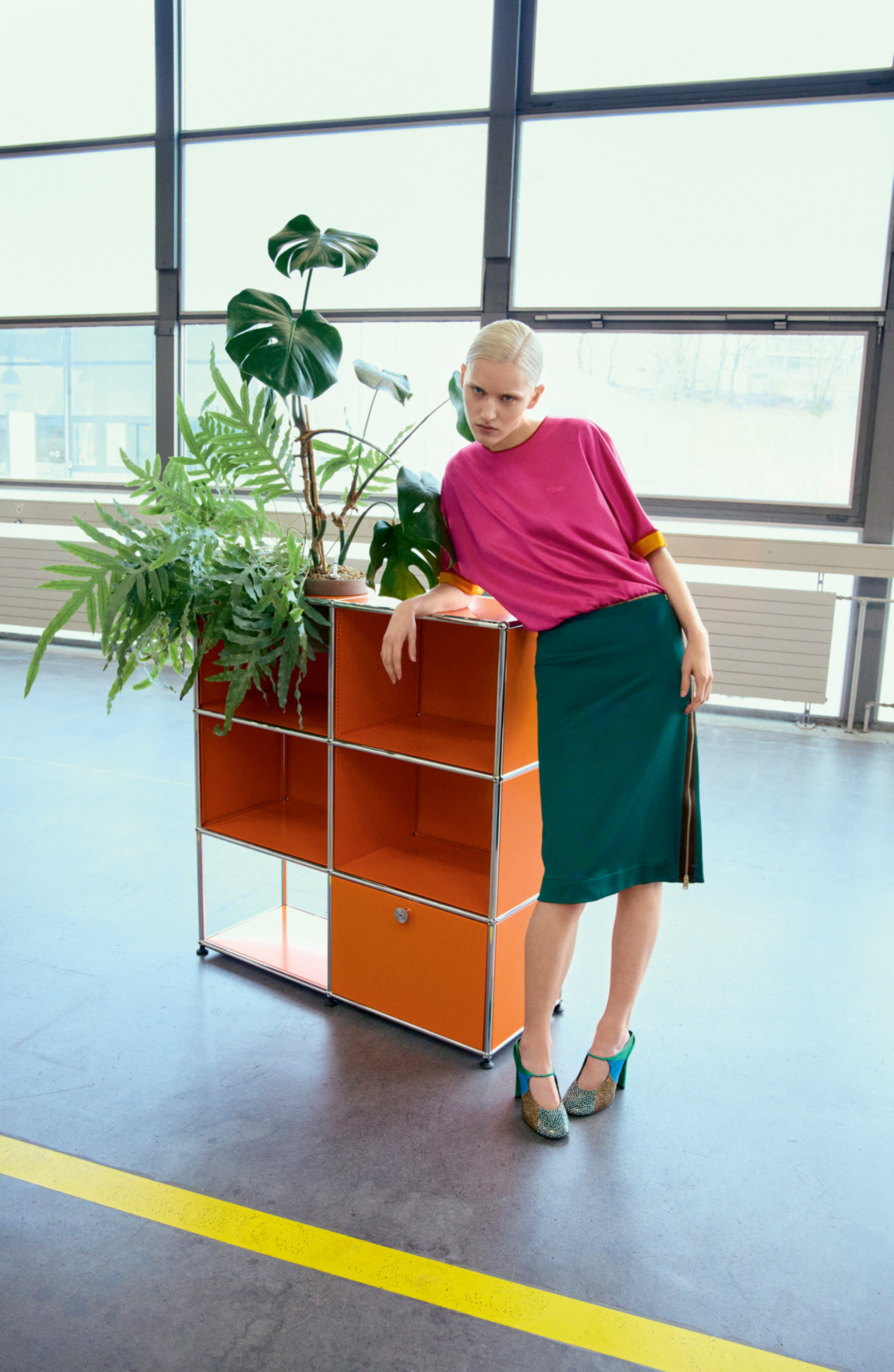 Sideboard in Reinorange mit integrierten Pflanzen, USM.