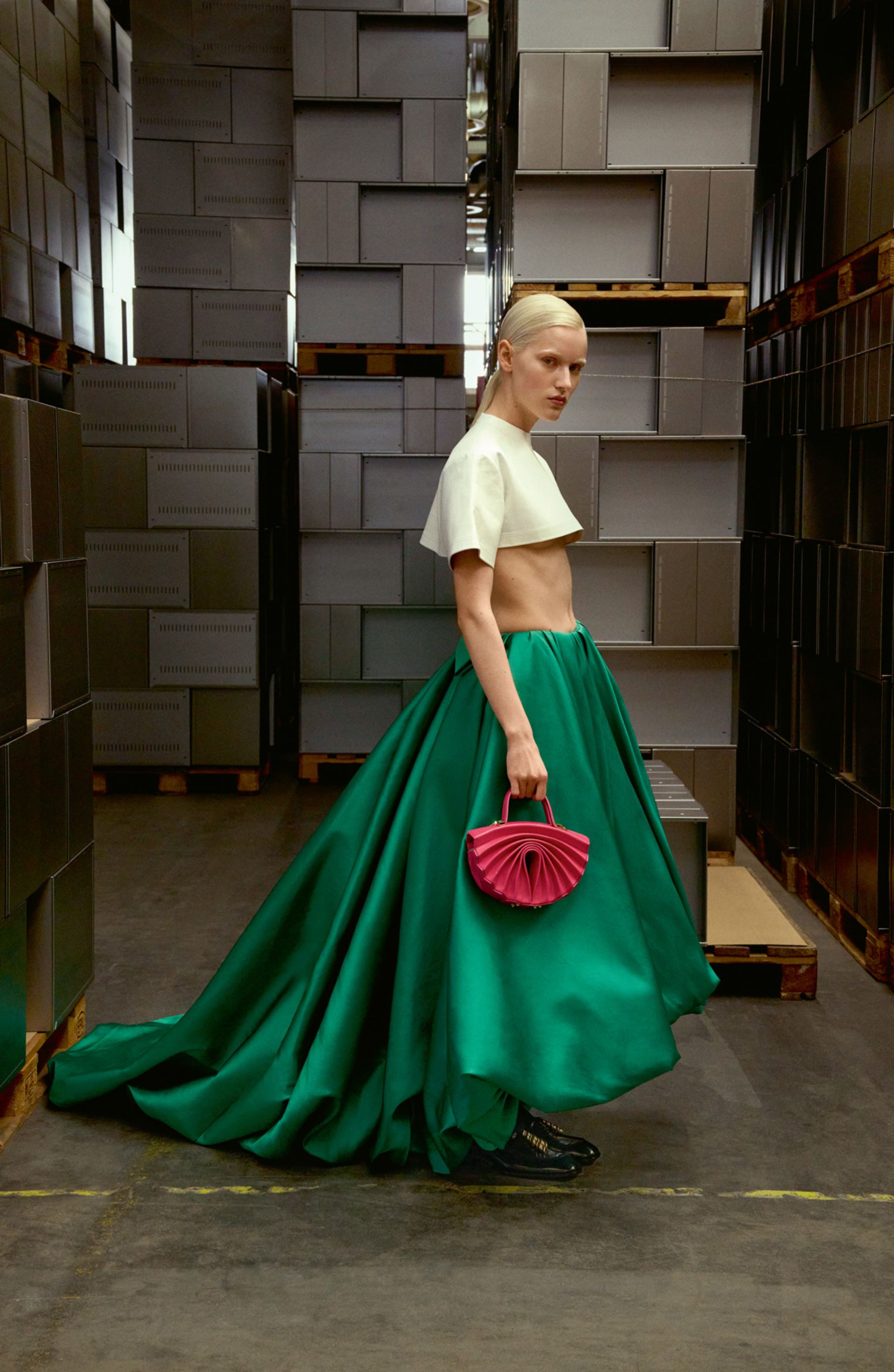 Kurzes, weisses Top aus Leder und langer Rock aus grünem Satin, Balenciaga.