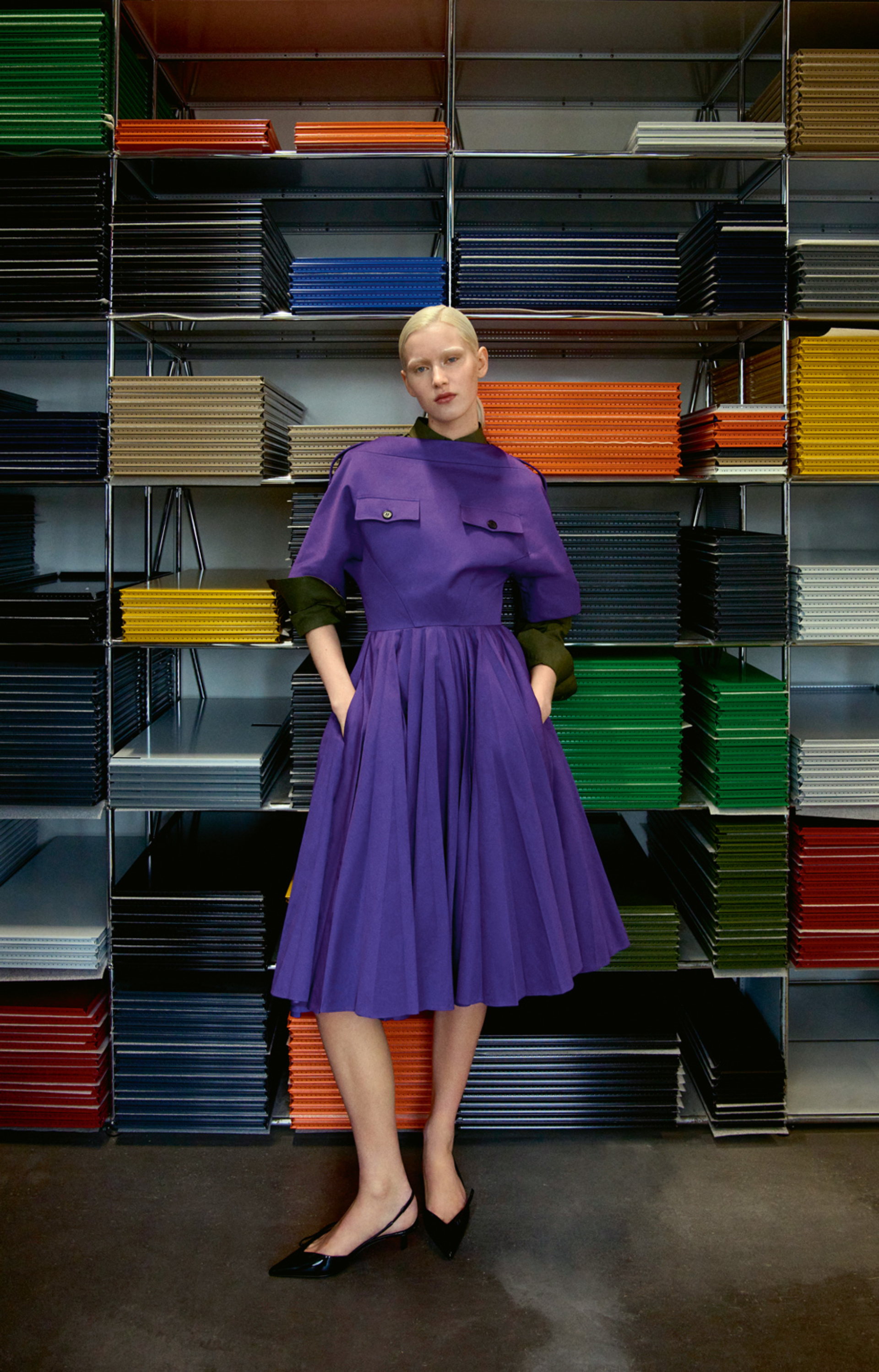 Lila Kleid aus Chino-Baumwolle, Hemd aus Popeline-Baumwolle in Khaki, schwarzer Pumps aus Lackleder, Prada.