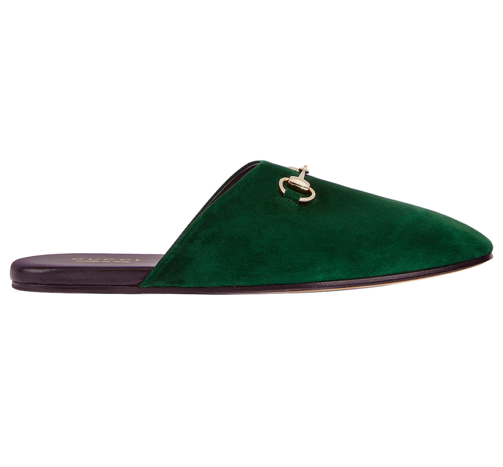 Dunkelgrüne Wildlederslipper mit Horsebit-Detail, 770 Fr.