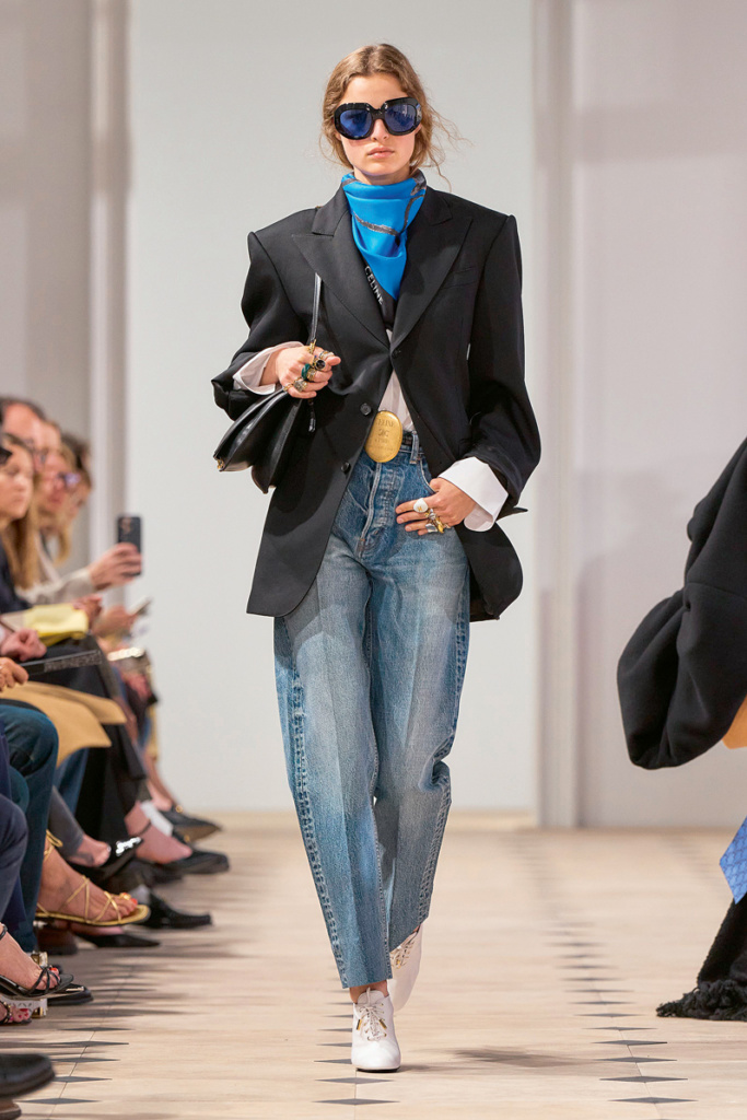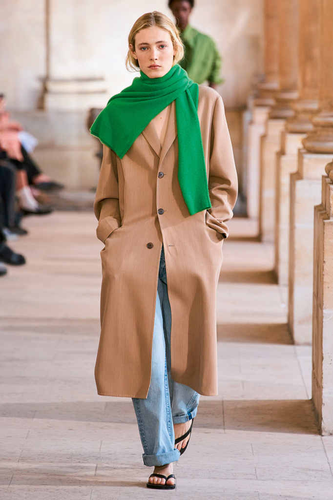 Porté avec son pantalon assorti, comme à droite chez Paul Smith, il dessine une ligne soignée, idéale du matin au soir. Dépareillé avec un jean, comme à gauche chez Celine, il devient plus libre, plus urbain, presque nonchalant. Tout dépend alors de l’attitude que l’on choisit d’adopter. Le foulard, noué au cou ou glissé sous le col, apporte cette touche de chic qui change l’équilibre du look, une pointe de couleur est toujours bienvenue pour affirmer un regard personnelle.