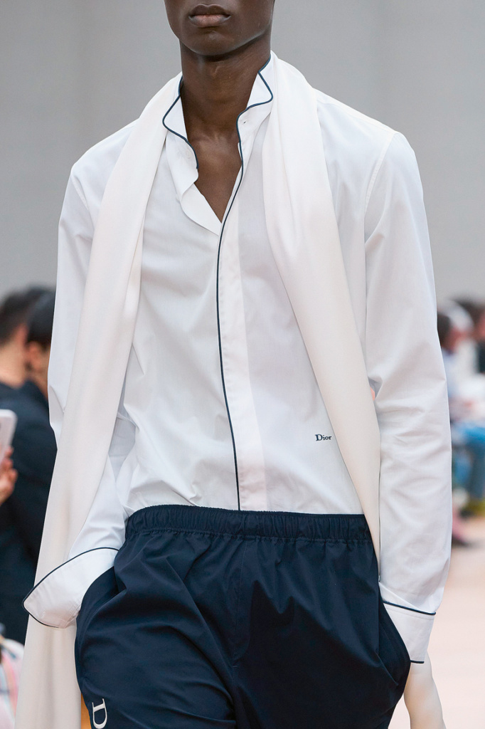 À droite, chez Dior, le col officier ouvert, délicatement souligné par un passepoil contrasté, brouille les lignes entre distinction formelle et désinvolture maîtrisée. Ici, chaque choix compte. Une couture parfaitement placée, un col subtilement détourné, une finition pensée comme un signe de style à part entière. La chemise dépasse son statut d’essentiel pour devenir une pièce manifeste. Et si l’on préfère se passer du logo brodé, apposer ses propres initiales apparaît comme une manière plus intime d’affirmer son charisme.