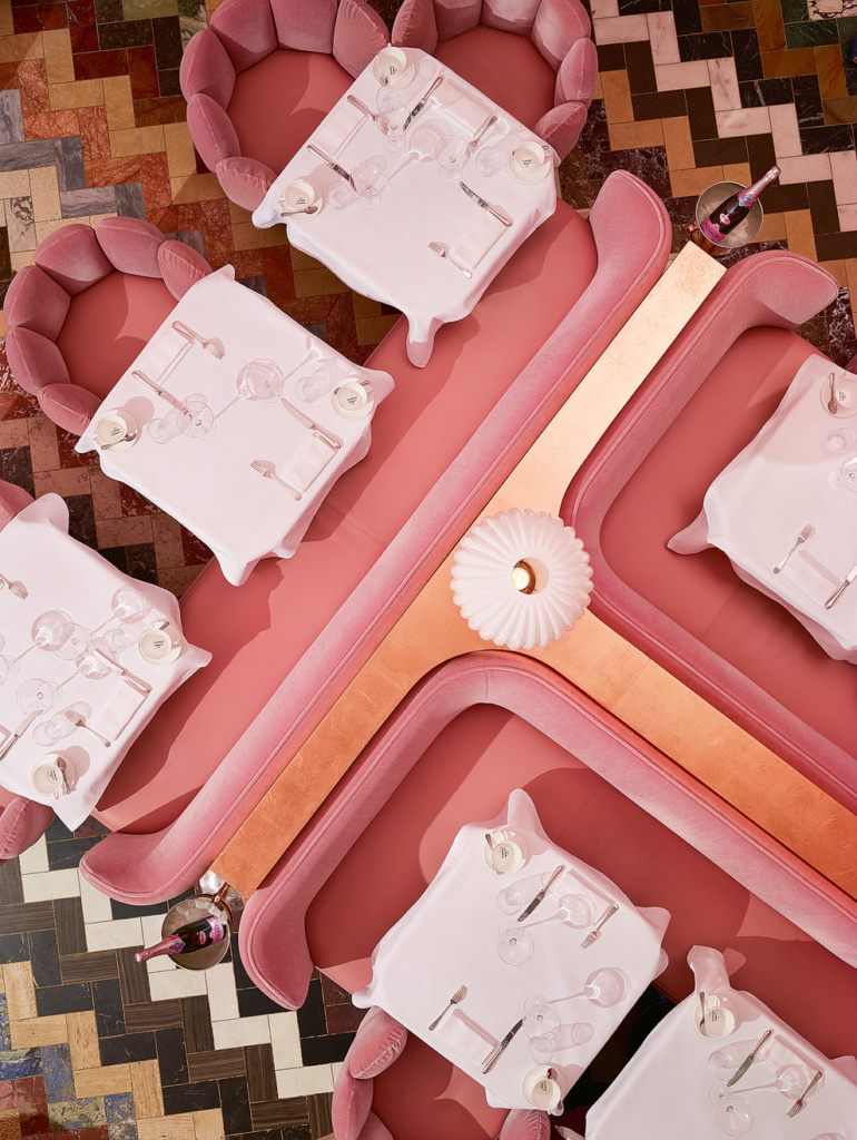 Lorsque j’ai conçu le Sketch, Instagram en était encore à ses balbutiements, je n’avais aucune idée qu’il deviendrait viral. Cet espace cubique n’avait pas de fenêtres. J’ai décidé intuitivement de lui donner une forme de douceur, de féminité et de le traiter entièrement en rose, monochrome. Pour moi, c’était une nouvelle façon d’aborder la couleur. J’avais une certaine facilité à les manier alors qu’en général, il y a une véritable réticence à les utiliser. Et moi, au contraire, je manie la couleur avec une certaine habileté. Je m’en suis amusée au début de ma carrière, je mélangeais aussi bien les couleurs que les motifs et je me surprenais moi-même de cette facilité – et puis, cela a inspiré toute une génération de jeunes décoratrices. Alors utiliser le rose de façon monochromatique à une plus grande échelle a été une réponse surprenante et nouvelle – je ne m’étais pas rendu compte à quel point les gens étaient beaux dans cette pièce rose! Comme s’ils avaient passé deux jours au soleil.