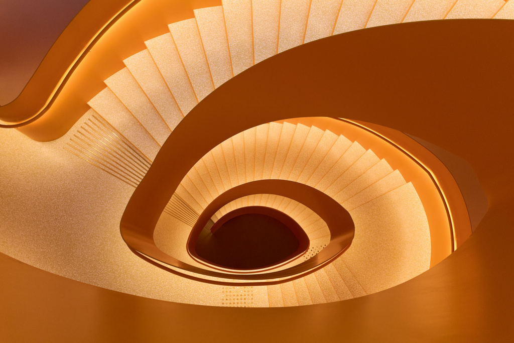 L’année dernière, le musée d’art moderne et contemporain PoMo a ouvert ses portes à Trondheim, en Norvège. La créatrice a conçu la cage d’escalier en collaboration avec l’architecte Erik Langdalen – le métal brille d’un orange vif.