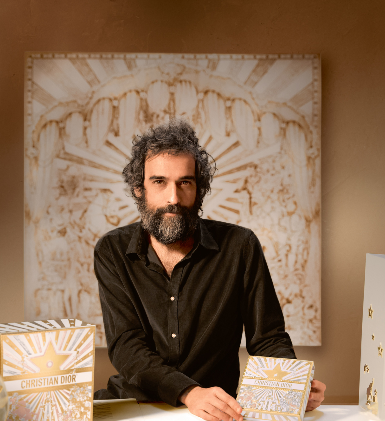Notre collaboration a commencé en 2017, par la création d’un décor de défilé, pour les 70 ans de la maison. C’était aux Invalides, à Paris, où il y a la tombe de Napoléon. Dans cet espace immense, une scène énorme de 3 000 mètres carrés célébrait un voyage mythique qu’avait fait monsieur Dior en 1952, aux quatre coins du monde. J’ai représenté les plantes et les animaux qu’il aurait pu rencontrer. Puis j’ai commencé à réaliser d’autres dessins pour la maison, pour des imprimés, des motifs de broderie, des détails sur des accessoires et, pour la troisième année, ces campagnes de Noël pour Christian Dior Parfums. Je viens, moi, d’un autre monde, je ne connaissais pas vraiment le luxe, mais j’ai d’emblée été sensible à la dimension historique de la mode, à toutes ces merveilleuses archives. Et les intérêts de monsieur Dior recoupent beaucoup les miens: sa passion des fleurs, sa fascination pour la dimension poétique de l’astrologie ou le merveilleux.
