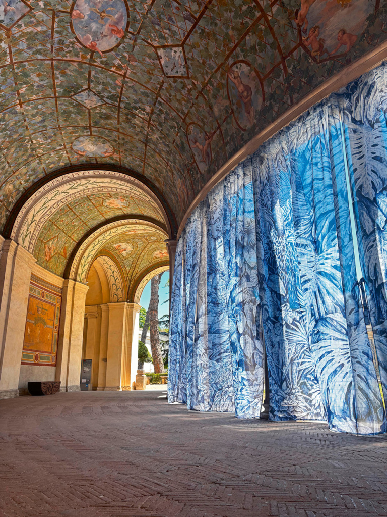 La Villa Giulia est une architecture conçue comme un théâtre en plein air, un lieu merveilleux, avec ou sans ces voiles. J’y ai représenté une forêt primaire, une sorte de jungle un peu paradisiaque. C’est aussi un dialogue entre les arches, très minérales, et le monde végétal qui bouge au vent.