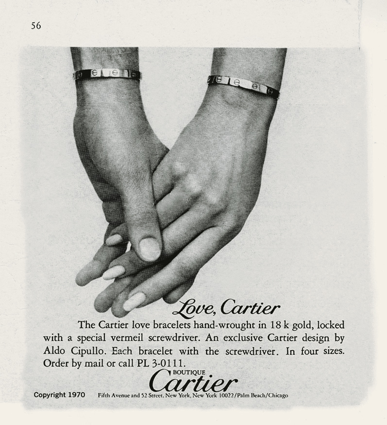 Un paradoxe, en apparence? En 1969, alors que Woodstock bat son plein à Bethel, dans l’état de New York, et célèbre l’amour libre, ce Napolitain d’origine, imprégné de dolce vita, imagine un objet qui scelle en quelque sorte une relation amoureuse. «Ce bracelet, qui signifie quelque chose de très engageant, connaît un succès immense. La preuve que, malgré l’évolution des mœurs, malgré ce gain de liberté, apparent en tout cas, l’investissement dans une relation reste quelque chose de très important.» Très vite, Love fait l’objet d’une publicité emblématique, représentant une main d’homme et une main de femme, chacune portant un bracelet. Là encore, la méthode – des pages de publicité dans les grands quotidiens new-yorkais – est révolutionnaire et atteint sa cible.