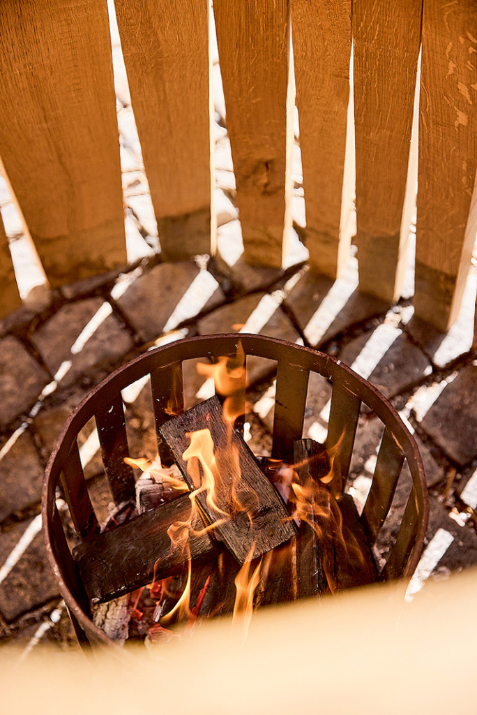 À ce stade, la forme ronde du tonneau n’est pas encore visible, car c’est le cintrage des douves qui permet d’obtenir la courbure souhaitée. Pour cela, le bois doit être chauffé avec un tact extrême. Au centre du tonneau, Martin Thurnheer allume un feu dans un panier métallique, pour rendre le bois malléable. Durant toute la procédure, le futur fût doit être continuellement aspergé d’eau, car c’est la vapeur ainsi produite qui l’assouplit. Des câbles en acier, fixés à l’extrémité inférieure du tonneau, tirent ensuite les douves vers le bas. Une fois cette opération terminée, l’intérieur du tonneau est «toasté», c’est-à-dire qu’il est encore traité au feu. Plus longtemps le bois est chauffé, plus il développe de tanins, qui seront plus tard transmis au vin.