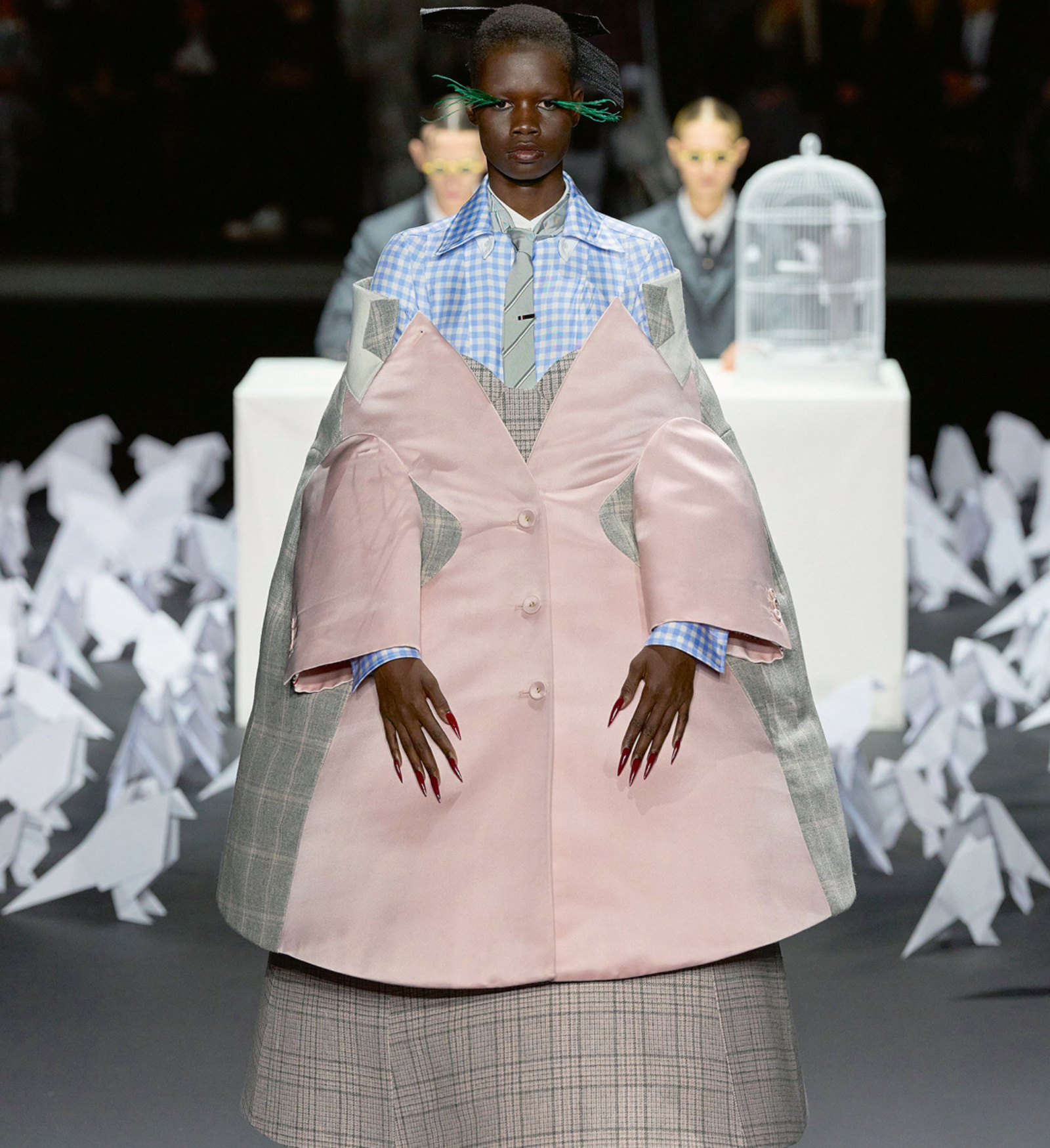 Au dernier défilé Thom Browne, 64 looks ont défilé sous 2000 grues en origami blanc symbolisant la paix. La capacité de transformation, l’évasion et le rêve ont été les éléments centraux de la collection. Broderies d’oiseaux, plumes sur les cils, les silhouettes étaient de vraies créatures surréalistes. Construites comme des carapaces mais aussi comme des armures contre le monde, les pièces de la collection explorent l’envol intérieur, le passage du quotidien vers l’imaginaire.