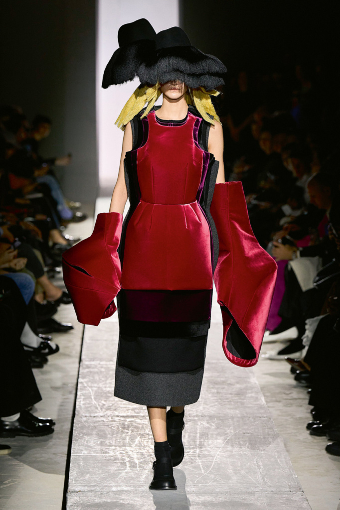 La designer japonaise Rei Kawakubo livre avec «Smaller is Stronger» une collection de vingt silhouettes représentant les injonctions auxquelles font face les femmes dans le monde du travail. «Récemment, nous avons eu le sentiment que les grandes entreprises, les institutions culturelles, les structures mondiales n’étaient pas si formidables que cela. Les petites entreprises ont aussi une grande valeur. Le petit peut être puissant», disait-elle à la fin de son dernier défilé. Montrer la domination en créant des formes sculpturales à base de robes empilées et de formes exagérées, voilà une manière pour la créatrice japonaise de continuer à proposer une mode libre et politisée.
