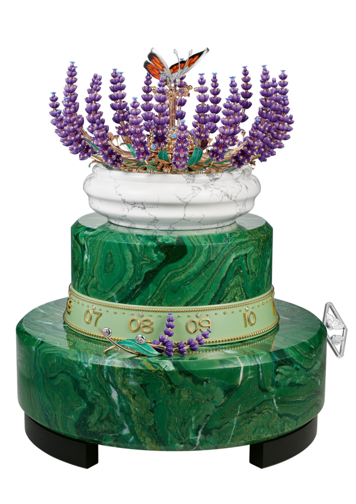 2024: Ors, améthyste, diamants, verdite, laque, ébène… Cette Brassée de Lavande imaginée par l’atelier de la Maison de la Mécanique d’Art pour le compte de Van Cleef & Arpels s’anime pour laisser échapper des papillons.